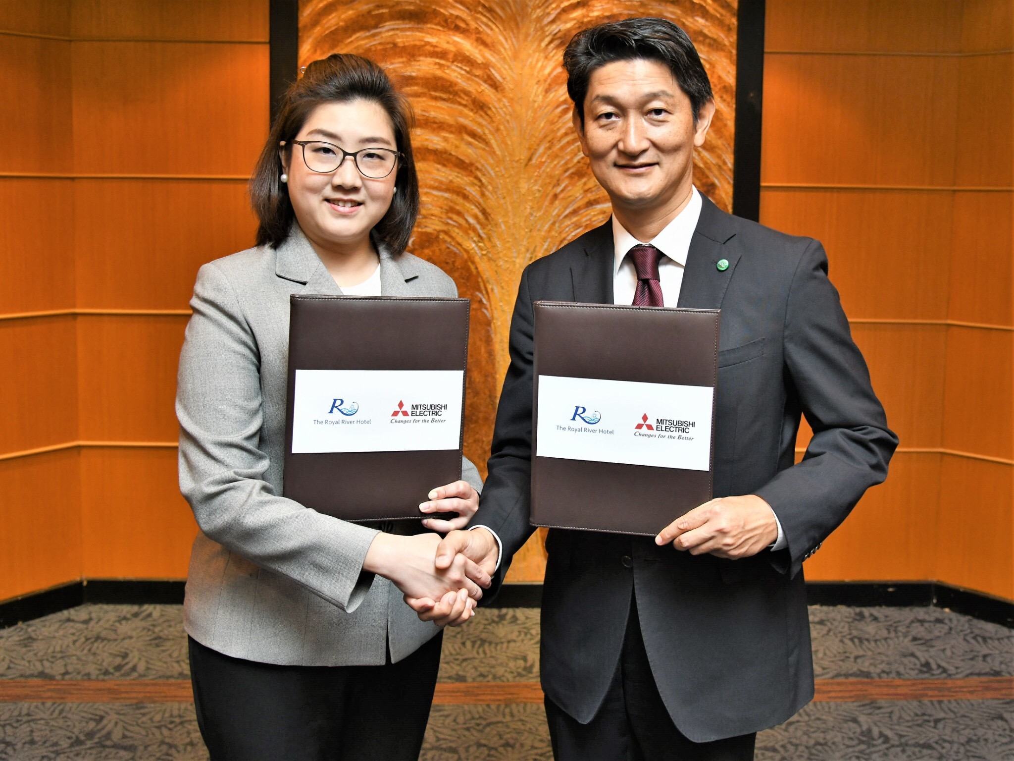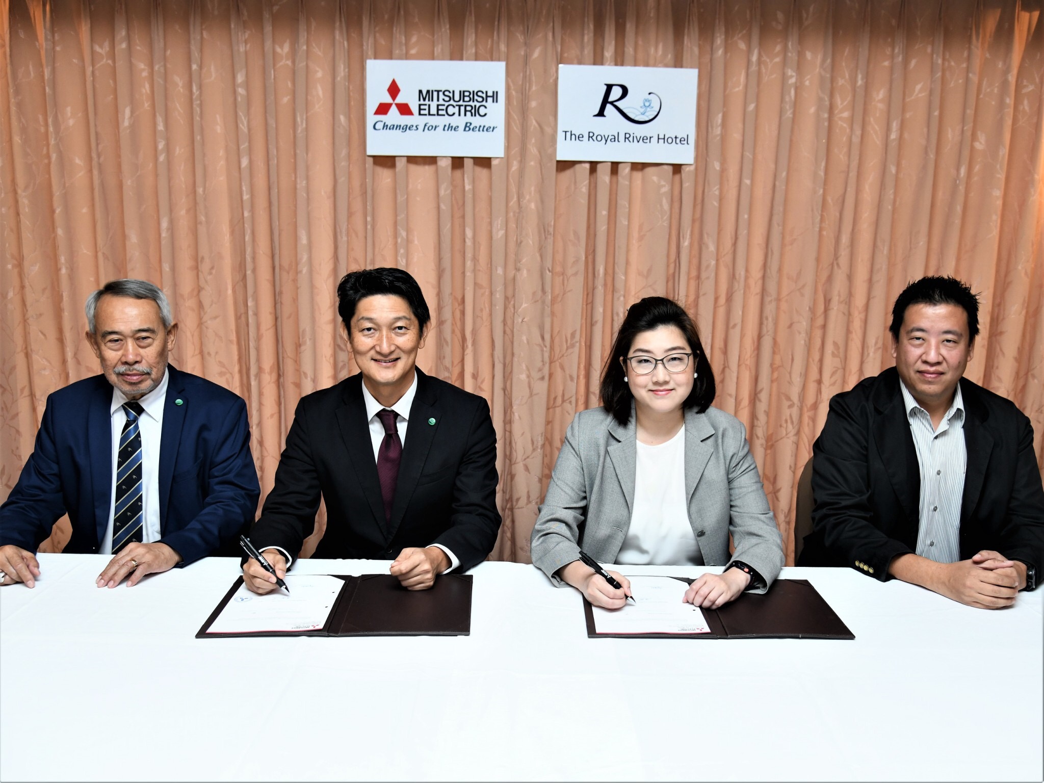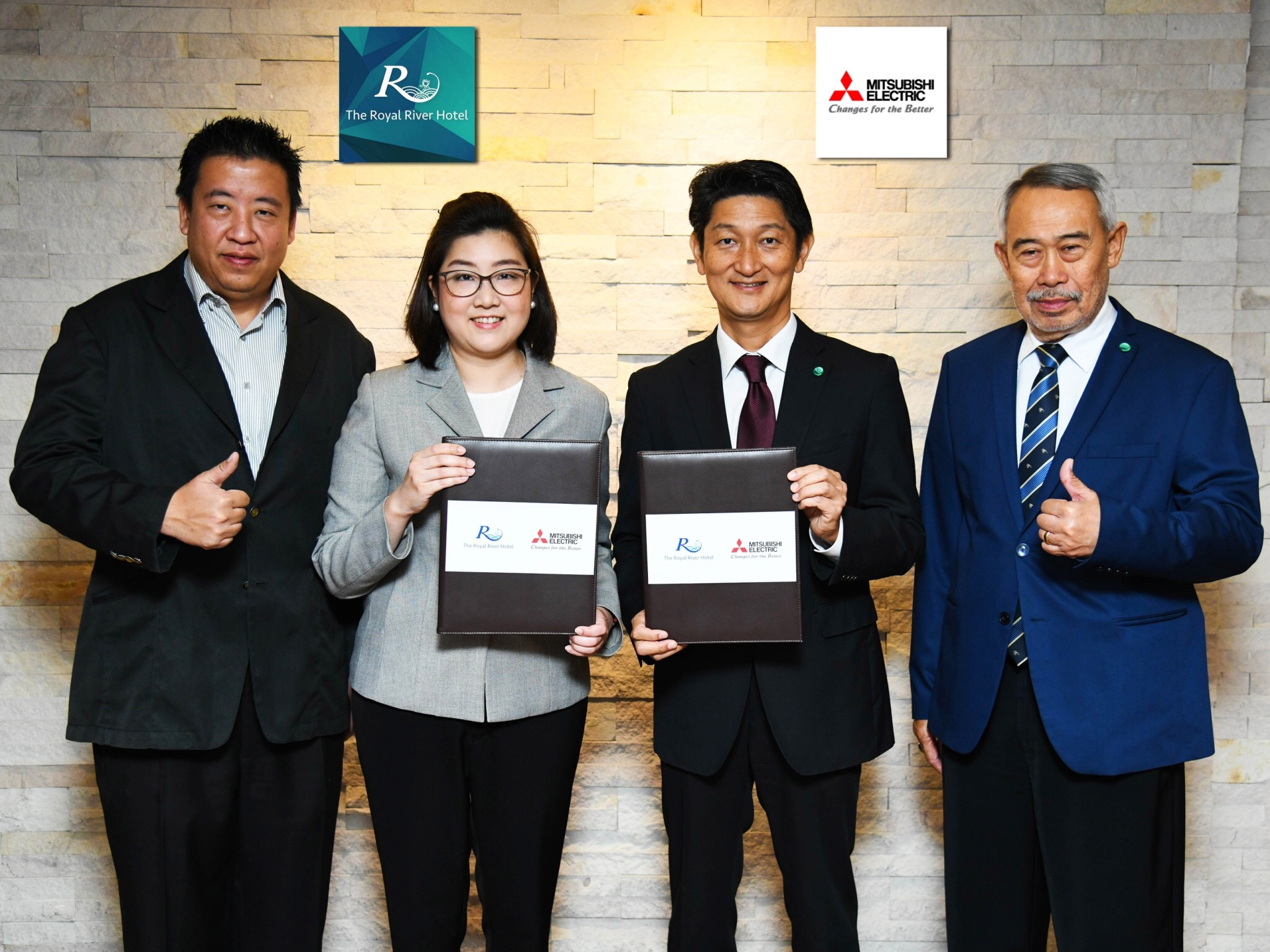 ผู้ช่วยกรรมการผู้จัดการ บริษัท มิตซูบิชิ เอลเลเวเตอร์ (ประเทศไทย) จำกัด ร่วมลงนามในสัญญากับ นางสาวนลินธร สกุลชัยวาณิชย์ (กลางซ้าย) กรรมการบริหาร และ นายตามโพธ ต่อสุวรรณ(ซ้ายสุด) ผู้อำนวยการฝ่ายการเงิน โรงแรมรอยัลริเวอร์กรุ๊ป เพื่อติดตั้งลิฟต์โดยสาร “มิตซูบิชิ เอลเลเวเตอร์” จำนวน 6 เครื่อง เพื่อยกระดับบริการให้ทันสมัยยิ่งขึ้น ณ โรงแรม รอยัล ริเวอร์ เมื่อเร็ว ๆ นี้