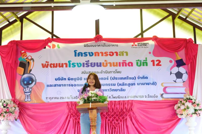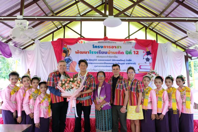 ผู้บริหารและพนักงานบจก. มิตซูบิชิ เอลเลเวเตอร์ (ประเทศไทย) ร่วมด้วย คณาจารย์ และนักศึกษาจาก คณะสถาปัตยกรรมศาสตร์ หลักสูตรนานาชาติ จุฬาลงกรณ์มหาวิทยาลัย ได้ทำพิธีส่งมอบอาคารโรงอาหารอเนกประสงค์ณ รร.บ้านโนนวิทยาพัฒน์ จังหวัดร้อนเอ็ด